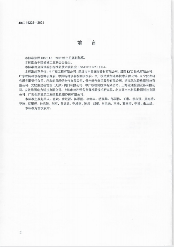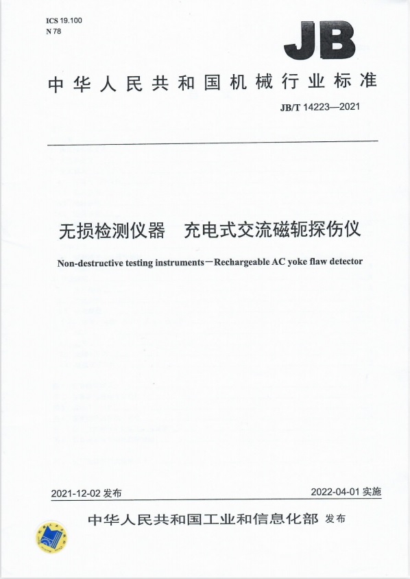 2022年4月1日,标准JB/T14223-2021《无损检测仪器 充电式交流磁轭探伤仪》首次颁布实施,自此,充电式交流磁轭探伤仪有了统一的技术要求及检验规则,这必将提升产品质量和行业秩序,我公司作为该标准主要起草单位之一及充电式交流磁轭探伤仪厂家,感谢试标委专业工作组的付出和努力!