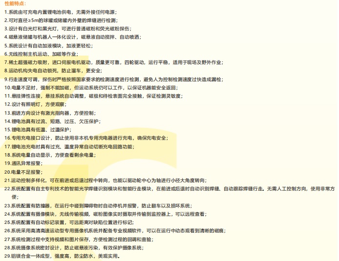 ZCM-X20-WX全自动磁粉检测系统 ZCM-X20-WX全自动磁探机器人为功能更齐全的自动磁粉检测系统,自带储、喷液装置模块,工作时无需外接其它磁粉喷洒装置,使用更方便。检测系统为我公司专利产品,由搭载有磁探机系统的爬壁机器人、监控器组成。 系统由内部可充电电池供电,不需要外接任何电源即可进行探伤作业,特别适合在野外及现场等接电不方便的场合下使用。 机器人在监控器的控制下加磁、喷洒磁悬液并匀速前进,从而实现自动磁粉检测。可对容器内外壁纵向、横向、斜向、仰向、平向等各向的焊缝进行检测。 内置白光灯和黑光灯,可进行普通磁粉和荧光磁粉探伤。 机器人采用铝镁合金一体成型,结构稳固结实,防尘防水,机器人永磁吸附,失电自锁,确保使用安全。 系统与传统检测方法相比,保证检测质量,检测效率大大提高。 系统自带磁悬液储罐,自动抽液、自动搅拌、自动喷淋,使用更方便。